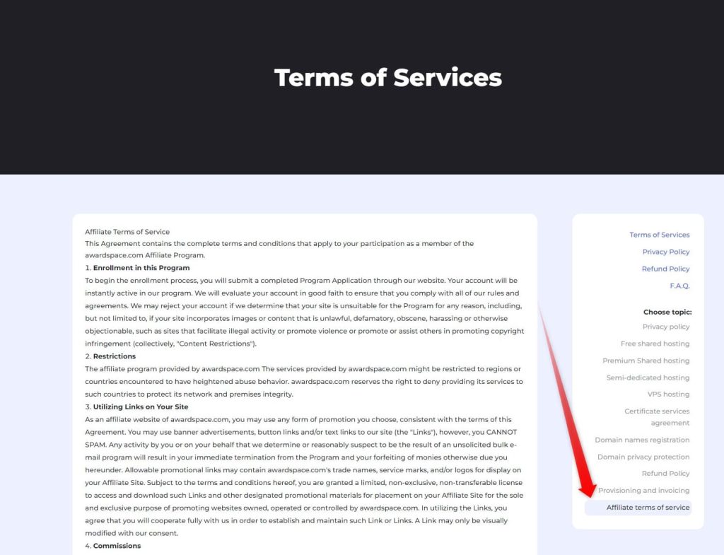 If you want to join AwardSpace’s web hosting affiliate program, you can check out our Terms of Services, and in the sidebar menu, choose Affiliate Terms of Service.