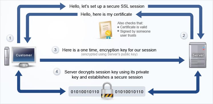 How does SSL work? Any data transmitted between the browser and your website is encrypted before being sent and then decrypted after having been received using the 128 or 256-bit key issued especially for you.