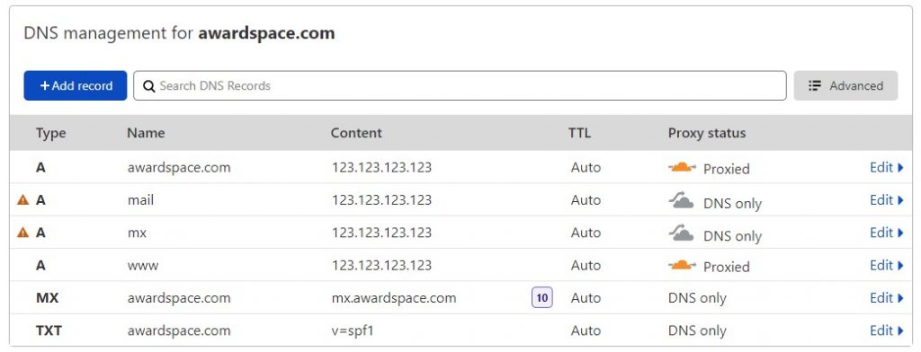 Nowadays CloudFlare has been an important part of security for the websites of many users. Pointing your domain to CloudFlare and managing your DNS records from there can be indeed easy to set up. However, configuring CloudFlare might not be such a straightforward process. If you would like to use CloudFlare for your domain and using our services you might experience troubles with our mail services. In this article, we will review how to configure CloudFlare in order to use AwardSpace mail services.