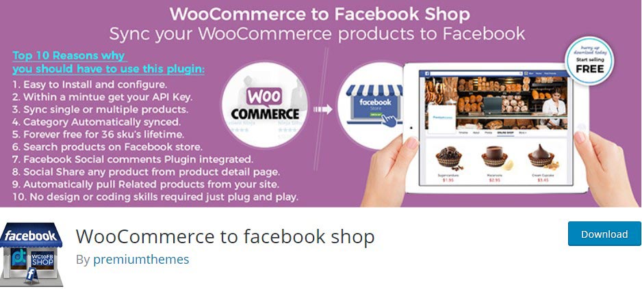 WooCommerce to Facebook shop WooCommerce is a freemium plugin by the premium themes. You can readily attach your WooCommerce products to Facebook with this plugin. It also enables you at any moment to synchronize and unsync the products.