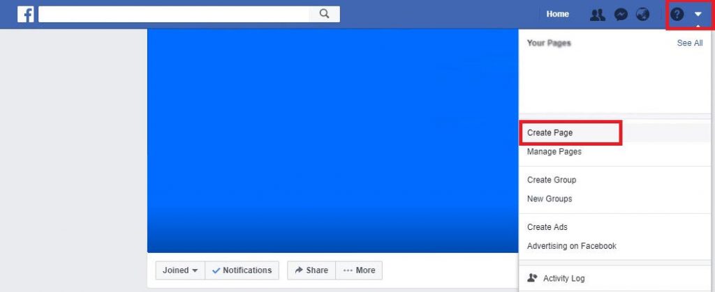 Log in to Facebook, go to the top right, and click the Create Page option.