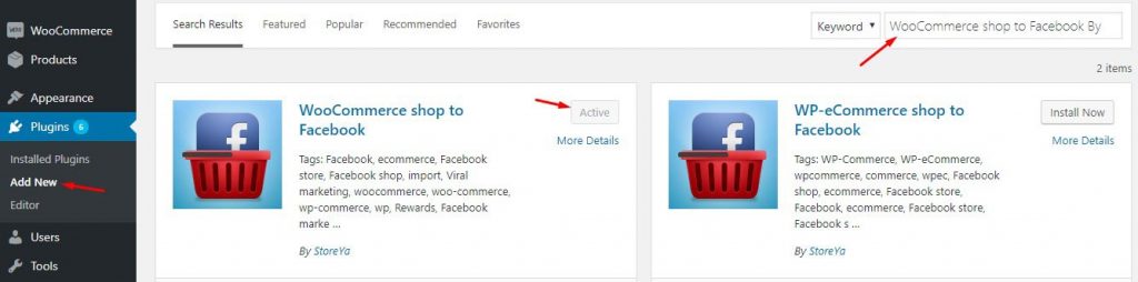 Go to the WordPress Admin Dashboard to install the plugin, navigate to Plugins > Add New. Click the search bar in the right table and tap “Facebook By StoreYa’s WooCommerce store.” Next, the plugin is installed and activated.