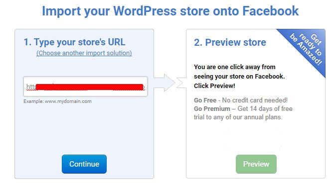 Your next action is to, attach the store’s URL and press the Continue button to export the WooCommerce shop to Facebook.