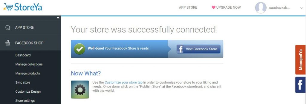 You will be redirected to the dashboard of StoreYa and obtain the signal of achievement: “Your store was successfully connected!”