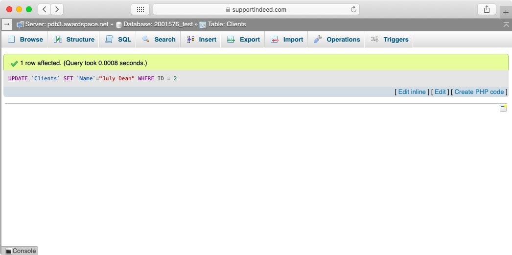 We can then issue one last SQL query to make sure that the record with an ID of 2 has indeed been updated: