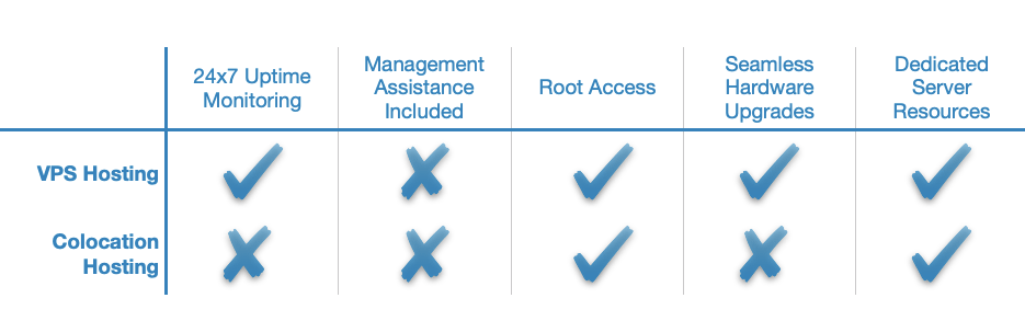 Since colocation hosting and dedicated server hosting are functionally the same, all points that were made in our VPS Hosting vs Dedicated Server Hosting comparison still apply. Colocation hosting diverges from dedicated hosting in that the client is responsible for bringing their own hardware and it offers the highest security of any hosting type. Additionally, colocation hosting clients should implement their own server/application monitoring since the colocation provider will likely only ensure that the server is powered on and will not be checking whether its applications are running properly.
