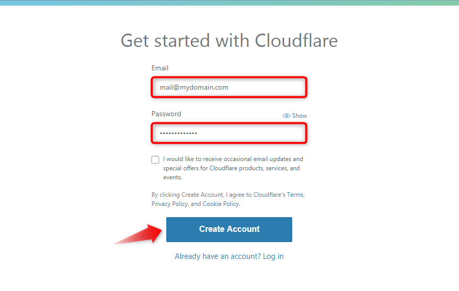 Note: If you would like to receive e-mail notifications and updates from Cloudflare, tick the check box that says I would like to receive occasional email updates and special offers for Cloudflare products, services, and events.