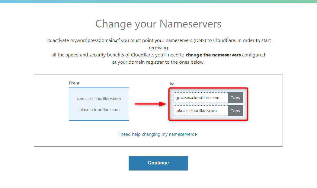 - Cloudflare will provide you with their associated Name Server addresses. The Name Servers will look similar to these: