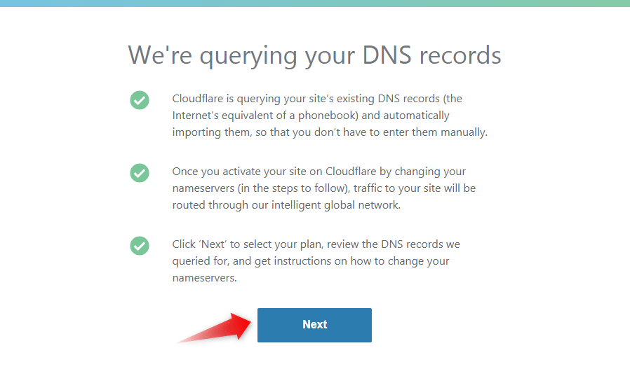 - Cloudflare will look up your existing DNS records. While waiting for their system to query your DNS server, click Next to select a suitable plan for your website.
