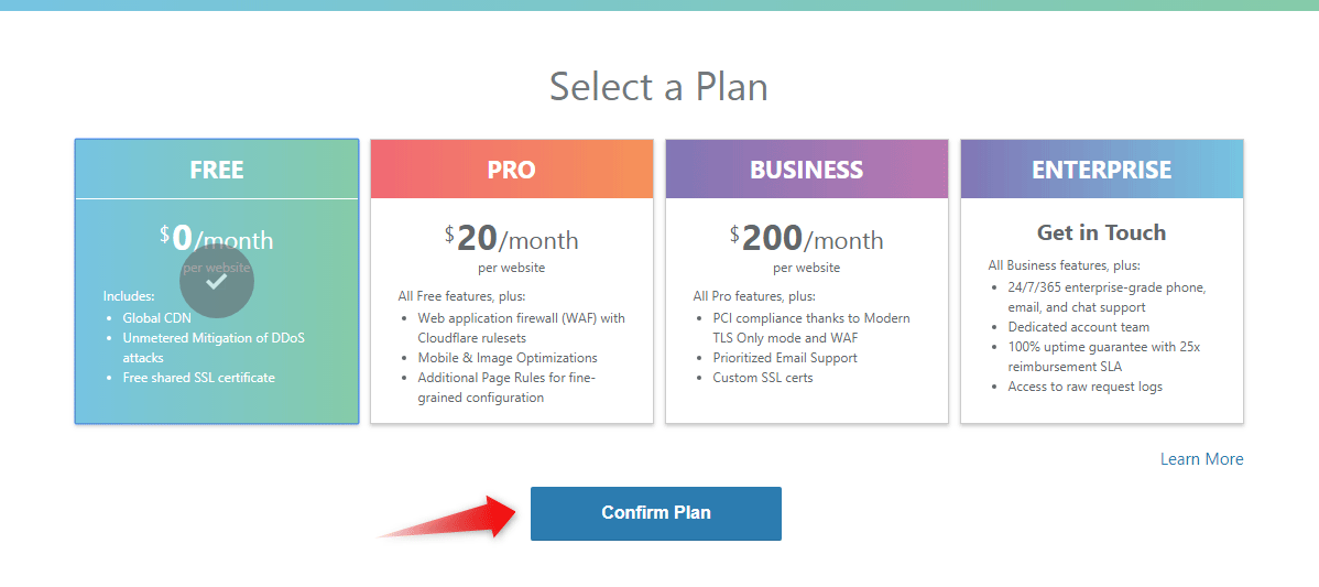 - On the next page, you will be asked to pick a plan. Choose the plan that best suits your needs and click the Confirm Plan link.