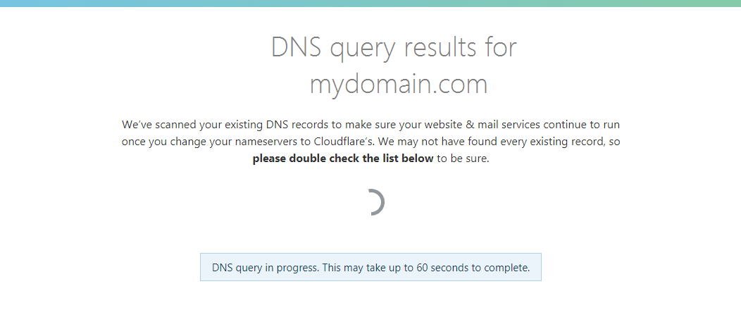 - First, you will need to wait for Cloudflare to finish the DNS scan on your domain name. Depending on your DNS configuration, the entire process may take up to 60 seconds.
