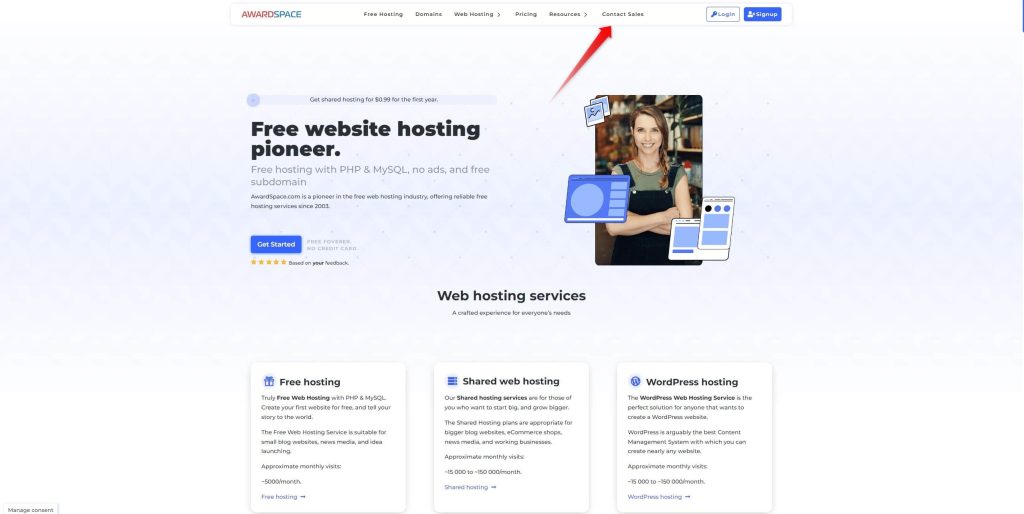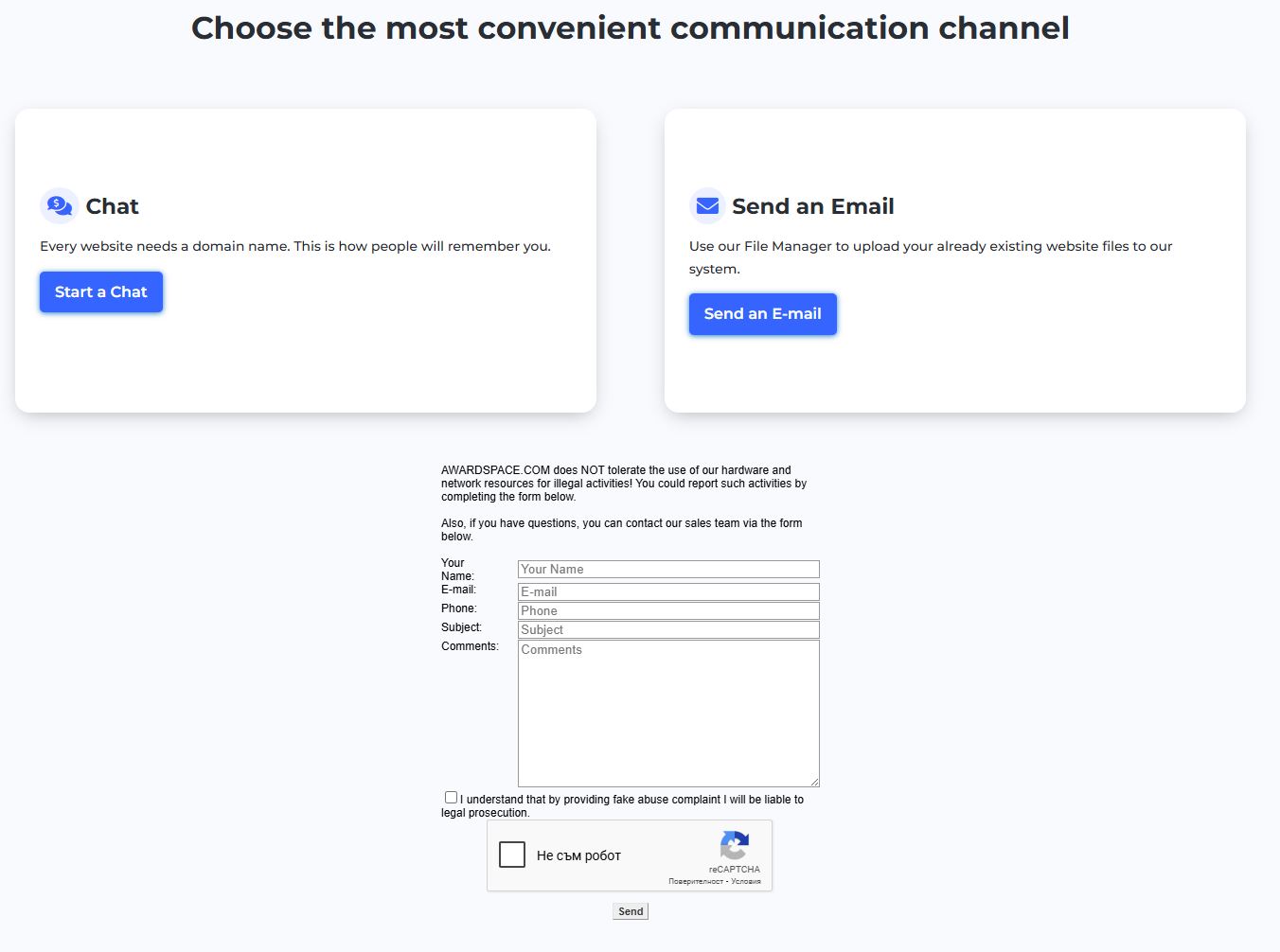 To contact the sales department of AwardSpace, you can use the button in the menu to open a chat, call us or send us an email.