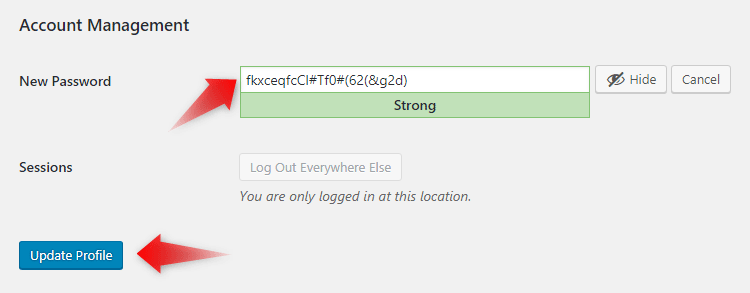 We also recommend you update your WordPress admin account password on a regular basis. To update your admin panel password, open the Users menu in your WordPress dashboard and click on All Users. Click on your administrative username and scroll down to the Account Management section. Enter your chosen password and press Update Profile.
