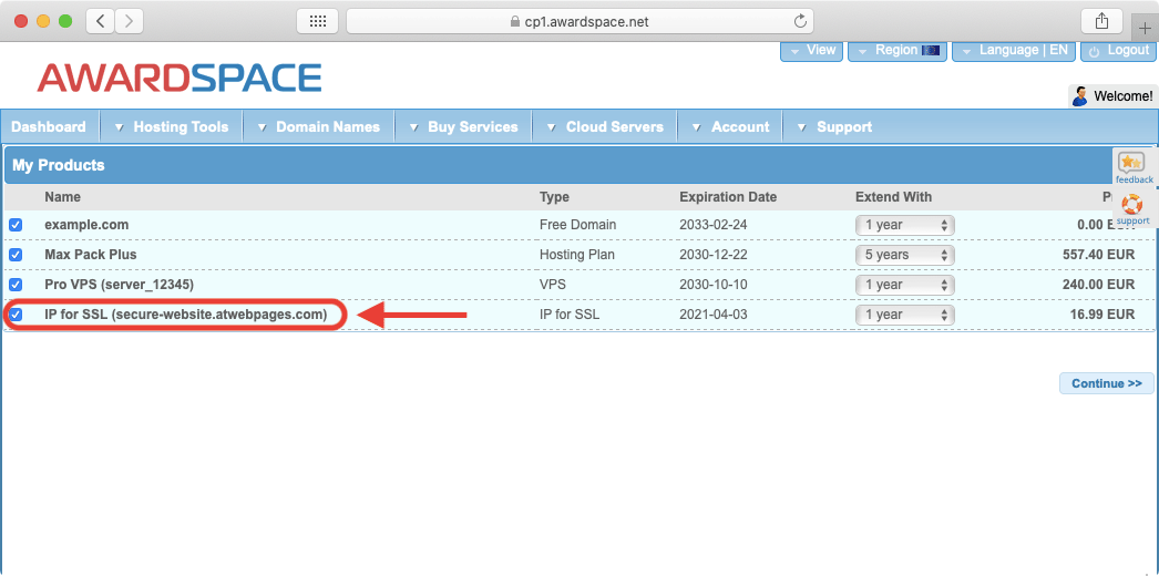 From there, select your IP for SSL as the product you wish to renew, choose the renewal duration, and press the Continue button. You will then be asked to provide your payment information. Once the payment is made successfully, your website should be fully restored within a few minutes.
