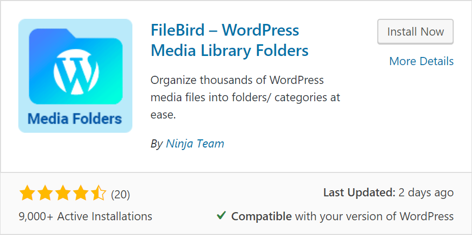 To organize the media files on your website, we recommend you to use FileBird. The plugin has a few thousand installations, a high review rating, and what is most important – it is frequently updated by the developers.