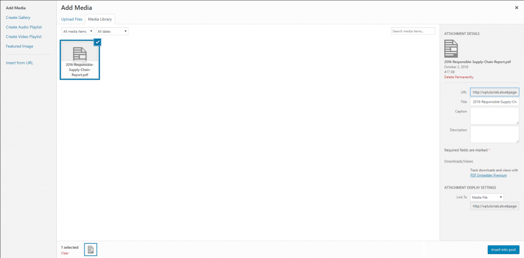 Choose the pdf file, you want to show to your users, and click Insert into post.