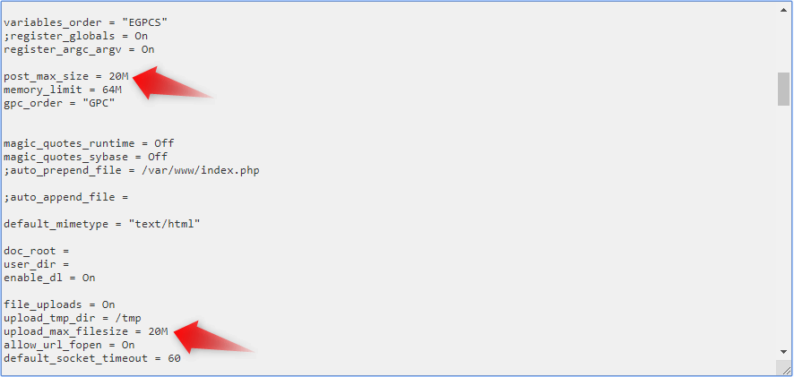 - Once you are inside the editor, locate the variables post_max_size and upload_max_filesize.