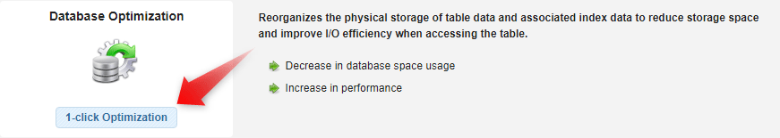 The AwardSpace Control Panel comes with a built-in solution for optimizing MySQL data. Simply go to the MySQL Manager and click on the Options icon right next to your database. Open the Management tab and select 1-click Optimization from the available options.