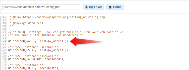 Once in the editor, look for the line that says define('DB_NAME'). In our case, the name of the database is 1234567_wpress.
