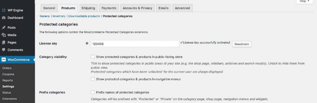 - Make sure to fill in your license key by going to WooCommerce -> Settings -> Products – > Protected Categories.