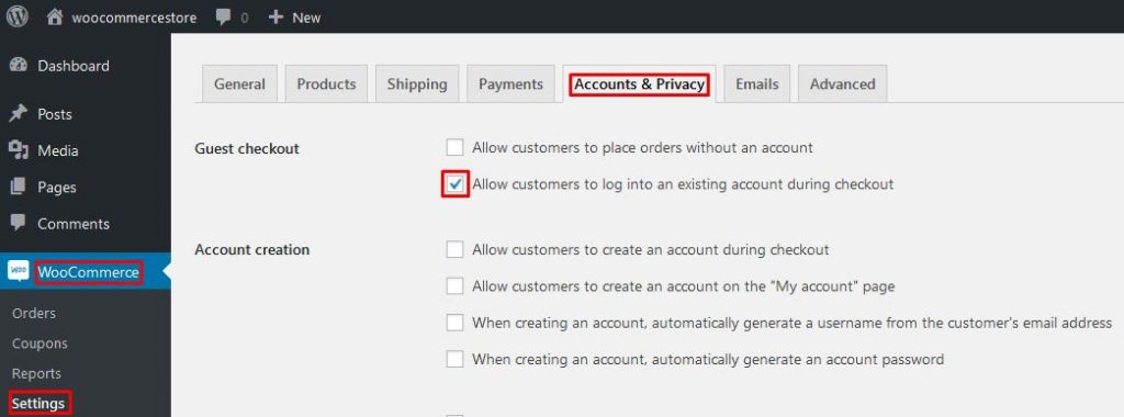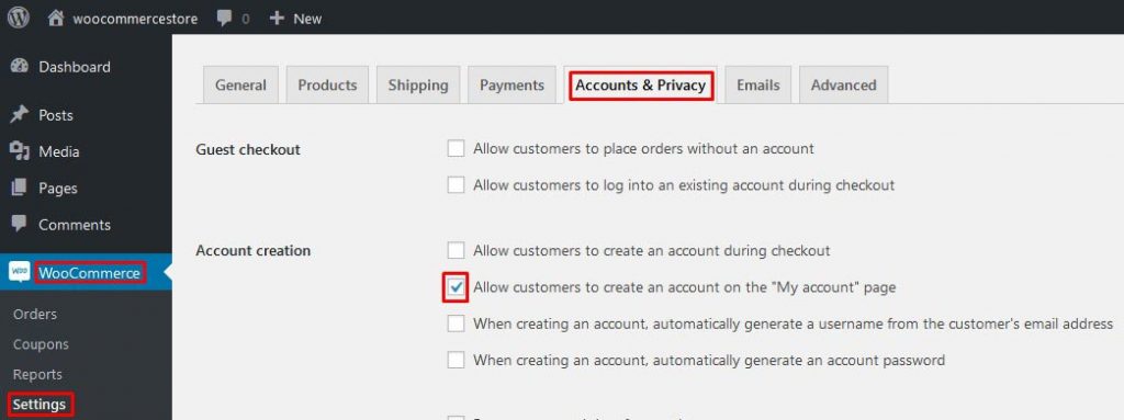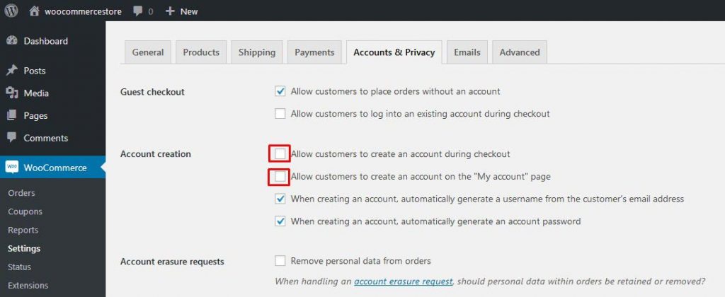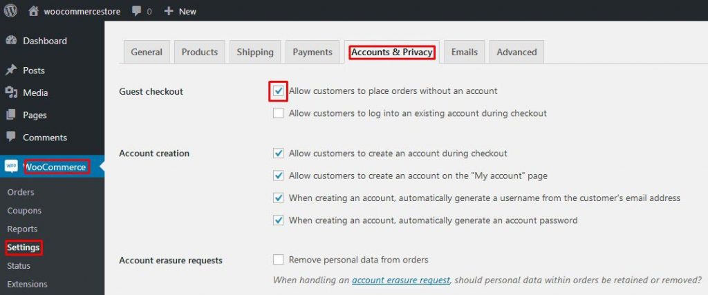 - From the WordPress dashboard, navigate to WooCommerce -> Settings -> Accounts & Privacy.