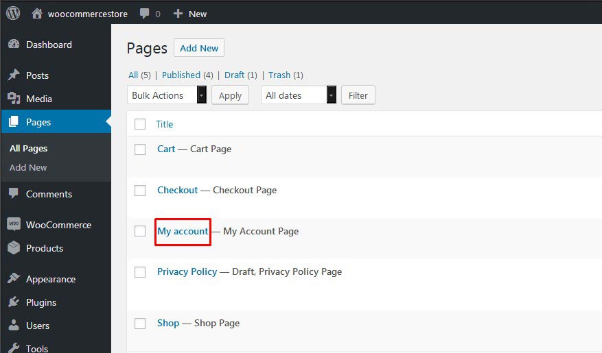 If you have done so, you’ll see a page My Account in the list of your pages (alongside other new pages for the shop, cart, and checkout). The [woocommerce_my_account] shortcode will show up in the content of the page. You can utilize this page as a sign-in or registration page, for instance by providing a link to it in your website header or the sidebar.