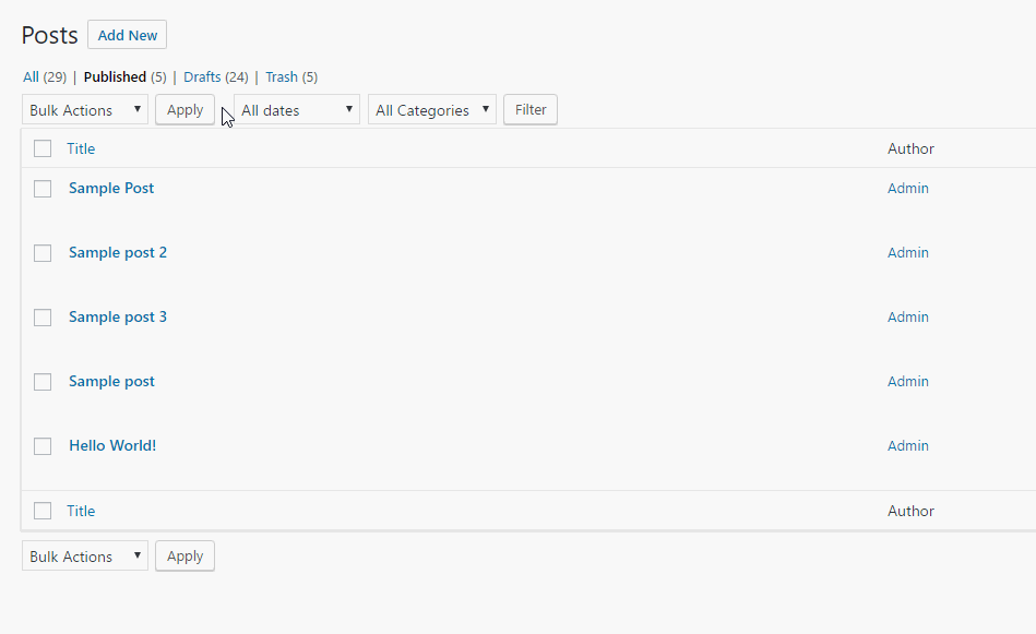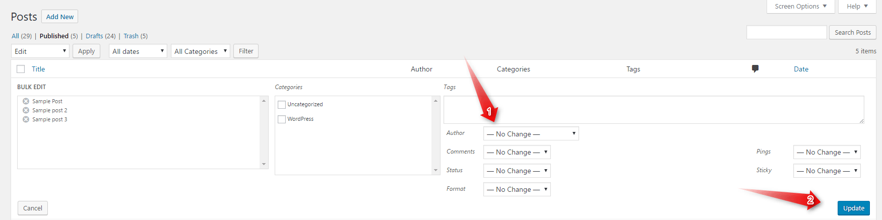 After clicking the Update button you should be returned to the previous layout. Here you should check two things – if the posts were edited successfully, and if so, who is the newly assigned author.