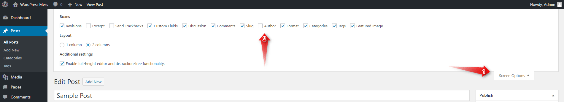 Here we will follow pretty much the same steps. While you are in the WYSIWYG, go to the top of the screen and look at the right corner. You should see a button that says Screen Options accompanied by one that says Help.