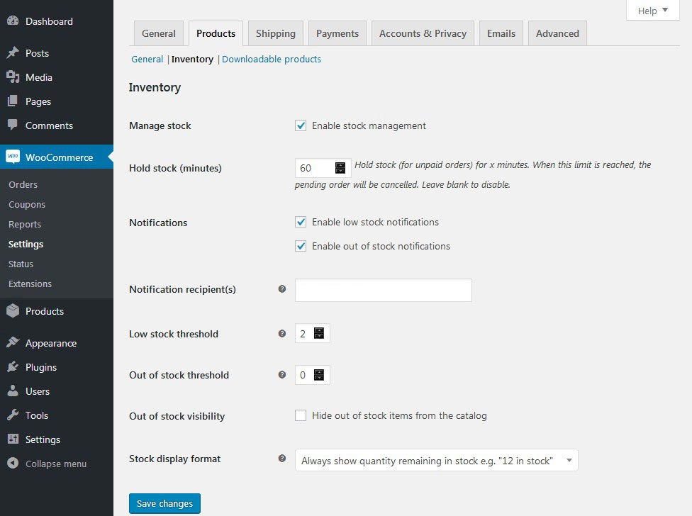 Go to WooCommerce -> Settings -> Products -> Inventory. This page will enable you to change the default stock preferences, as well as turn stock management on or off. You can likewise enable the notification to get email messages when an item becomes unavaiable.