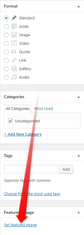 Choosing a featured image in WordPress is a straightforward process. What you need to do is to go to the page or post where you want to add a featured image to, and once your content is ready to be published (or before that if you feel like it) scroll down the page and look at the right sidebar.