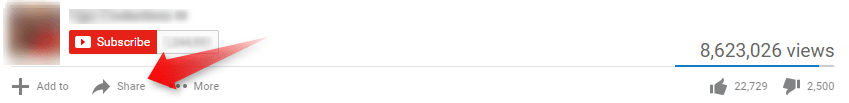 Under every video on YouTube, you can see a few buttons. Below the Subscribe button, you can find the Add To, Share, and More buttons. Click on the Share button.