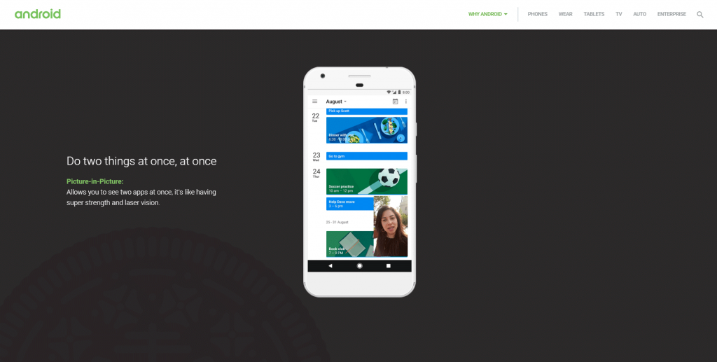 Android’s 8.0 Oreo page utilizes both horizontal and vertical space.