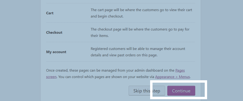 4. Get to know the main terms in WooCommerce and click Continue.