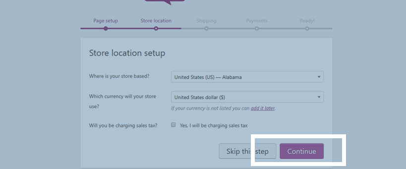 5. Choose where your store is located and what currency you accept. This will help with your shipping and payment settings. Click Continue.