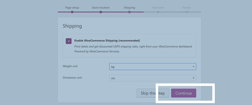 6. Choose weight and dimensions units and click Continue.