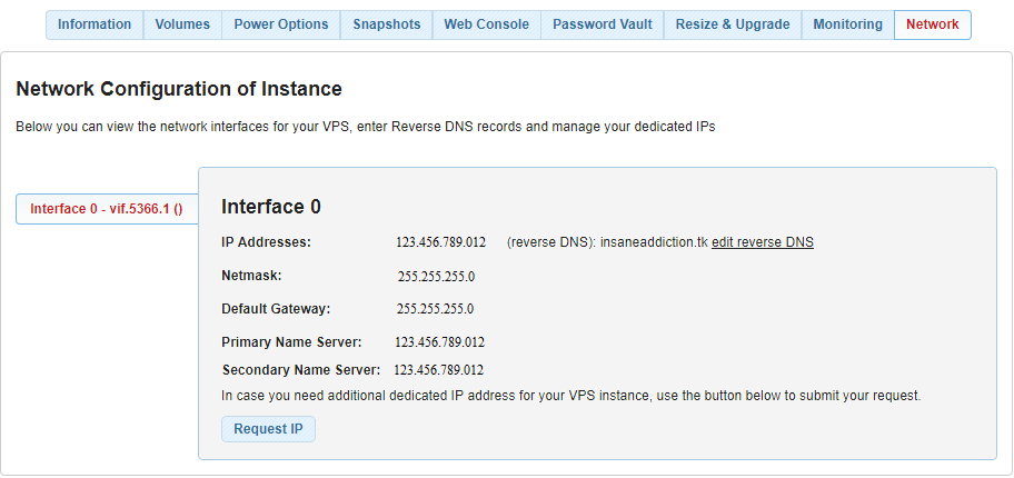 If you need to know your VPS machine’s IP address, default gateway or primary and secondary DNS servers, the Network section is the right place to go.