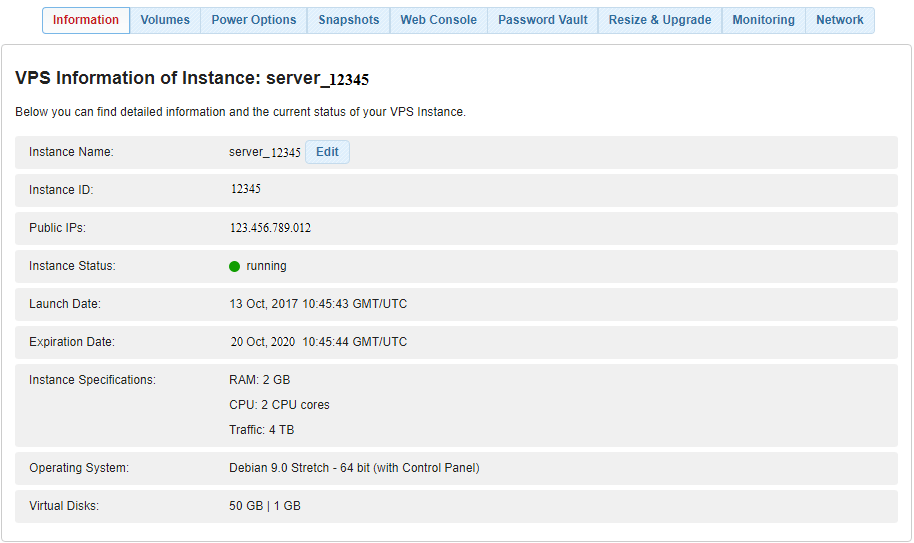 The Information section allows you to check the status of your VPS instance, as well as to view your dedicated server’s system configuration and expiration date.
