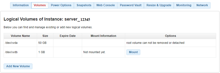 You are able to use the Volume feature to create a new volume on a server or attach (mount) an existing volume to your VPS instance.