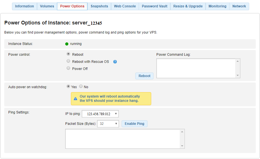The Power WatchDog function sets your VPS instance to automatically reboot in case your machine crashes or hangs up.