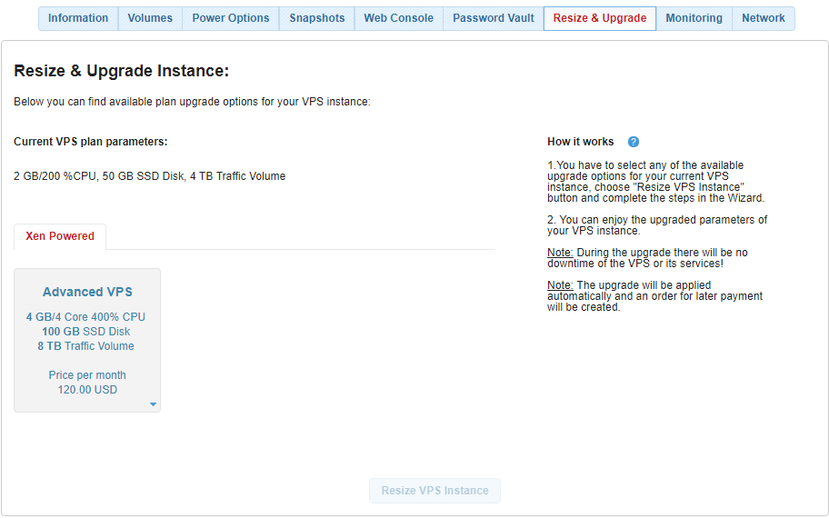 Resize & Upgrade offers a quick way to upgrade (resize) your existing VPS package.