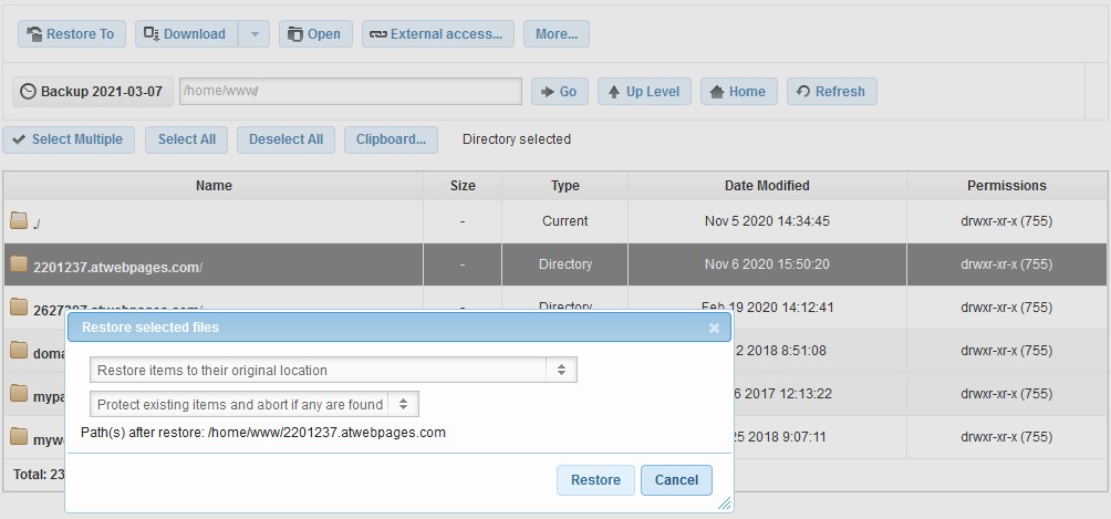 - You will be presented with a File Manager that contains all backups for your directories and files from the date specified.