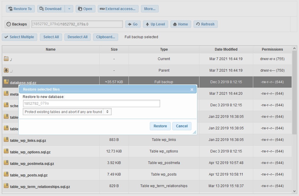 - You will be presented with a File Manager that contains the backup of your database