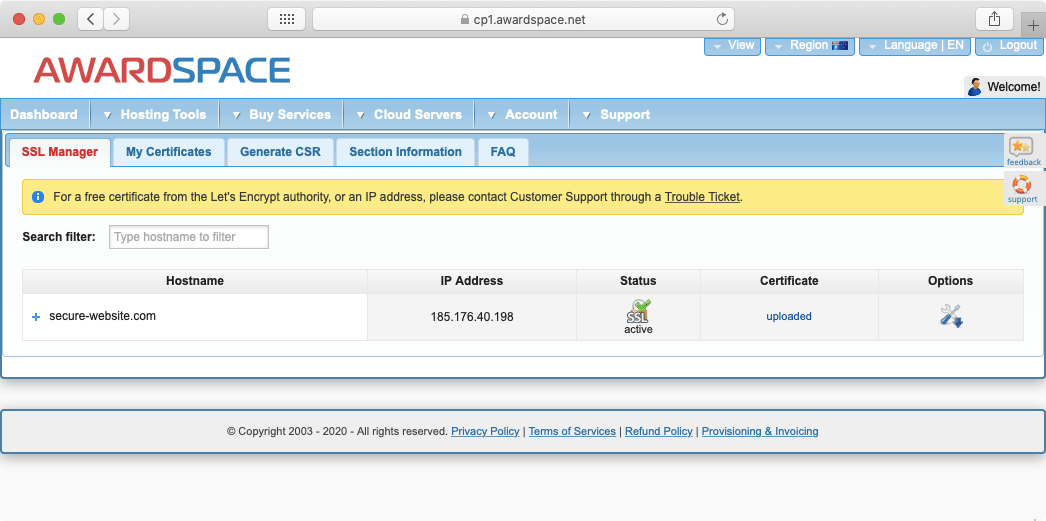 When you host your domain on AwardSpace and get a free SSL certificate from us, we will handle all certificate renewals for you. What is more, our 24/7 Technical Support Team is ready to assist you in case you have any issues with your SSL. All that you need to do is to make sure that you are using one of our paid hosting plans to take advantage of our free SSL features.