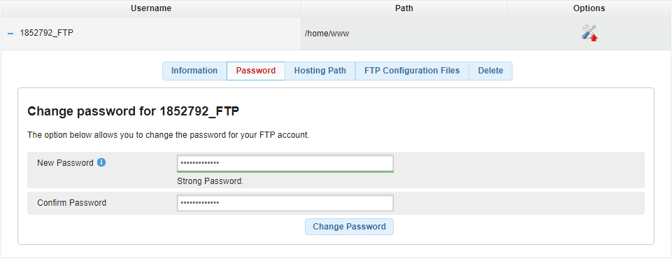 To change the password for an FTP account, click on the Options icon right next to the corresponding FTP username and open the Password tab.