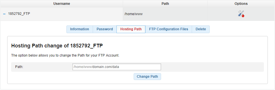 The Hosting (Directory) Path represents the access level of your FTP username for your hosting directories. A username with a Hosting Path /home/www/ has access and management rights over all files and folders on your FTP server.