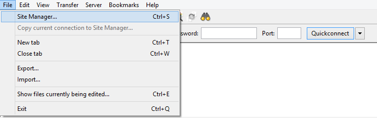 - Open the File menu and select Site Manager… or press Ctrl+S.