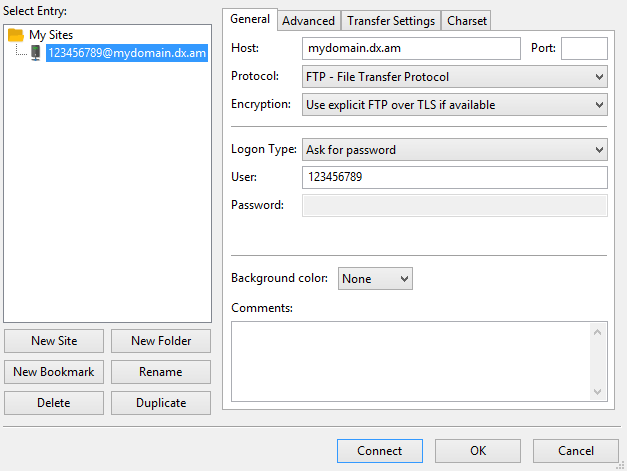 - In the left pane select the site you wish to connect to.