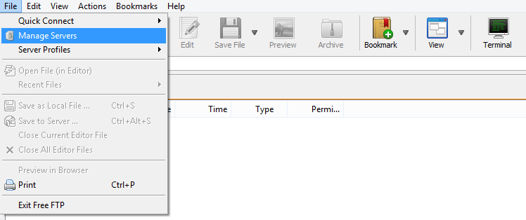 - Open the File menu and click Manage Servers.