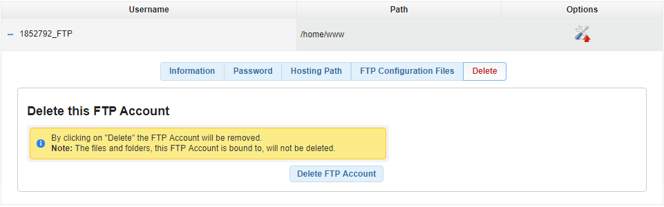 To delete a secondary FTP username, open the Delete tab and press Delete.