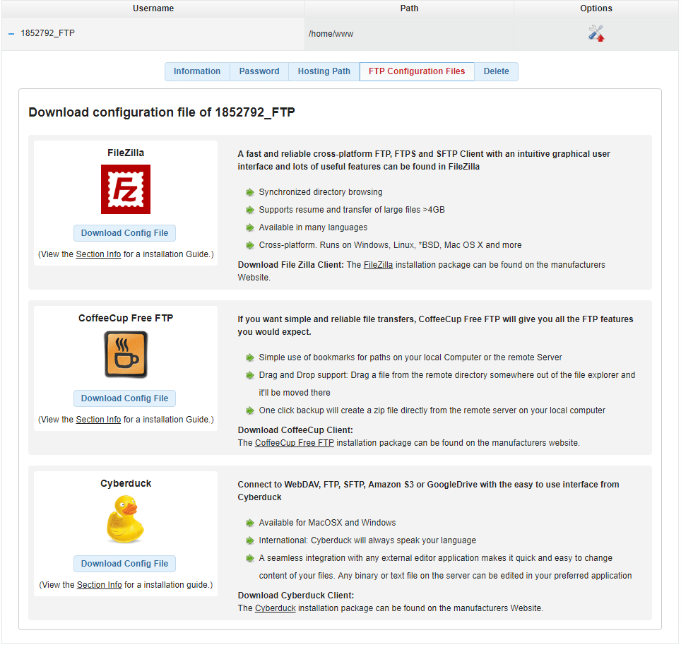 Open the FTP Configuration Files tab and click on the Download Config File button for your FTP client software.